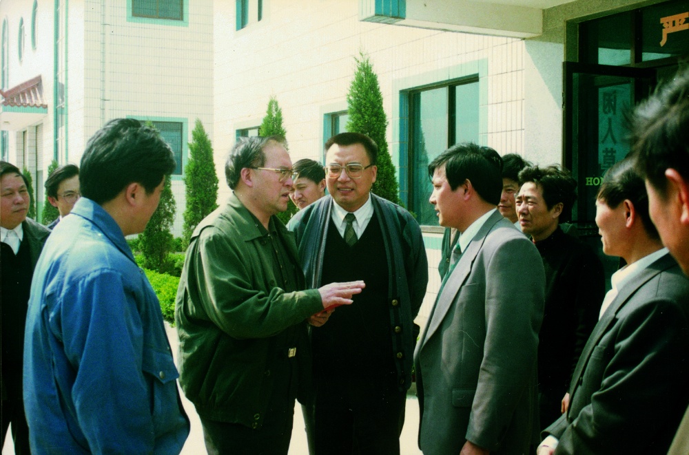 The former deputy minister of the Ministry of Personnel and the then governor of Zhejiang Province Wan Xueyuan (second from left) and other leaders in the guidance of Zhejiang Hongda Warp Knitting Co., Ltd.