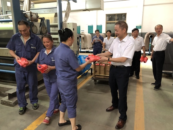 公司領導們,來到染整二部、染整一部等部門,向在高溫天氣中堅守崗位的一線員工表示親切的慰問和感謝。在生產現場,囑咐大家高溫生產不忘安全,做到勞逸結合;也要求各部門切實做好防暑降溫工作,保障員工健康安全。