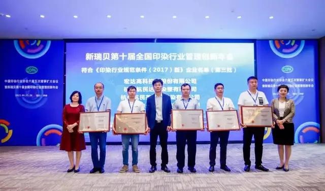 2021年5月19日, 第十屆全國印染行業(yè)管理創(chuàng)新年會(huì)在四川省樂山市舉行。本屆創(chuàng)新年會(huì)以 “精益重塑價(jià)值,智造賦能轉(zhuǎn)型”為主題,圍繞精益生產(chǎn)、智能制造、質(zhì)量管理、化學(xué)品管控等議題開展交流。會(huì)上對符合《印染行業(yè)規(guī)范條件(2017版)》企業(yè)名單(第三批)進(jìn)行了表彰,宏達(dá)高科副總經(jīng)理孫云浩代表公司上臺領(lǐng)獎(jiǎng)。