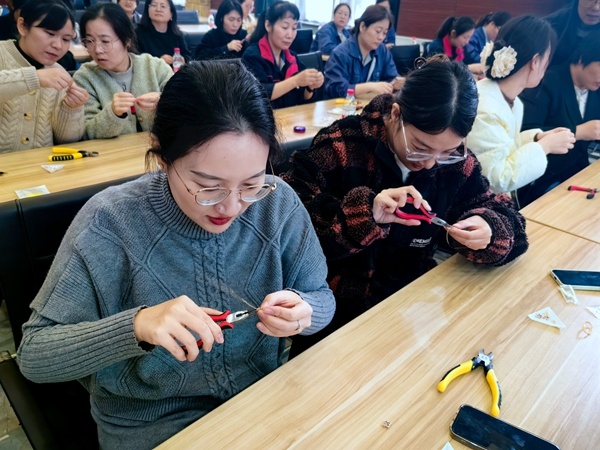 課堂上,海宮的專業(yè)老師拿起制作材料,向女職工們演示手串制作。現(xiàn)場女職工們面前擺放著手串的制作材料,以及珠寶鉗等制作工具。在老師的耐心指導(dǎo)下,大家紛紛制作起了手串,感受手工帶來的魅力。