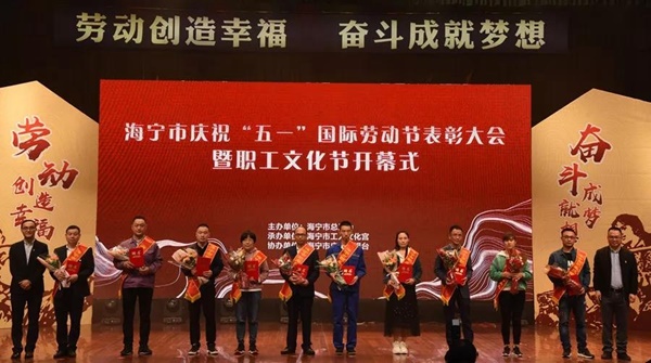 會上,10名2019年度海寧市最美職工、10名2019年度最美職工娘家人、20名海寧市第六批職業技能帶頭人和10家2019年海寧市“六好”品牌工會、11家2019年度海寧市高技能人才創新工作室受到表彰。宏達高科織造部陳國明被評為海寧市第六批職業技能帶頭人,并上臺接受表彰。