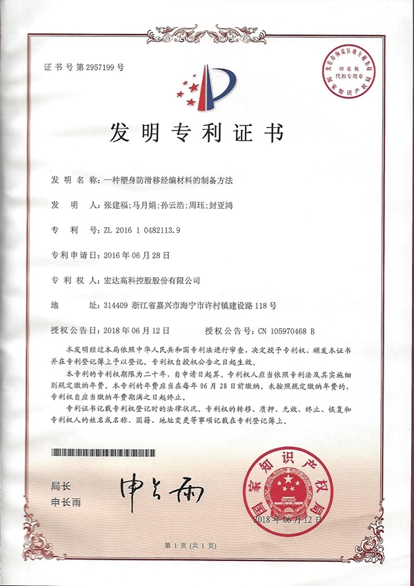 據了解,本次“宏達高科”獲得專利的發明內容是:一種塑身防滑移經編材料的制備方法;運用本專利所制備的運動服飾面料,其氨綸彈性纖維面與人體接觸時對皮膚具有一定的黏附性,能減小運動時服飾面料的滑移,從而減小摩擦;又因該面料拉伸彈性大,能對人體肌肉有一定的壓力、起固定作用,因此還能有效防止運動時造成的肌肉、關節受傷,減輕運動人員的肌肉疲勞度,提高運動塑身的效率和效果。另外2項獲得的外觀設計專利,是對公司自主開發的兩種汽車內飾面料進行的外觀設計專利保護。