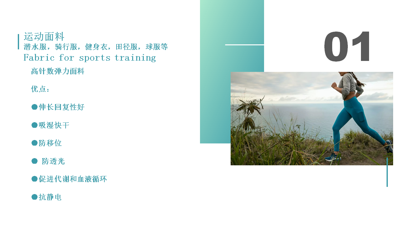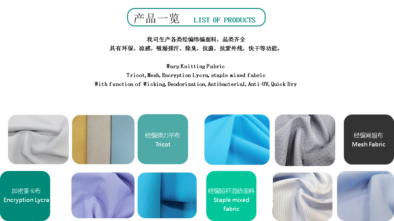 公司創造性的應用進口生產設備,精心采購國際優質原材料和染 化料,所生產的彈性和尼龍面料制作各種泳衣、潛水服、內衣、 文胸、睡衣的理想面料,具有穿著舒適,觸感輕柔、恢復性好易 吸汗、不產生靜電等優點,系列產品被評為“浙江省高質量科技 產品”。生產的網眼、起絨類經編面料,更是運動衣、體操衣、 滑雪衣、球類衣等的上乘面料之選。目前,公司生產的系列面料 已通過Oeko-Tex Standard 100生態紡織品認證,品質達到 國際先進水平,批量配套阿迪達斯等世界著名品牌,遠銷歐美。